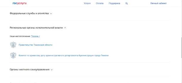- Далее кликайте по разделу «Органы местного самоуправления», затем «Органы местного самоуправления Тюменской области», затем «Территориальные органы и подведомственные организации» — «Администрация города Тюмень» - на загрузившейся странице в строке поиска наберите слово «лагерь».
